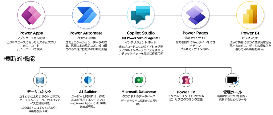 (格納したデータの多面的な分析を助けるサービス)、Power Pages(社外に作成したアプリや画面を共有し活用を可能にするサービス)の4つの主要サービスで構成されています。