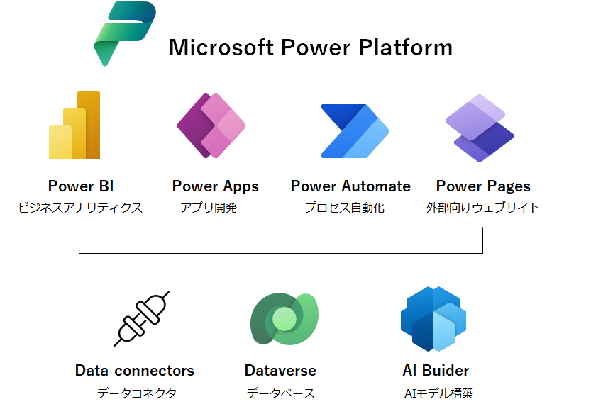 Power Platformは、ビジネスアプリケーションを作成・運用するための機能が統合されており、効率的な業務プロセスの構築やデータの可視化・分析が可能で、Power Apps、Power Automate、Power BI、Power Pagesの4つのコンポーネントで構成されています。